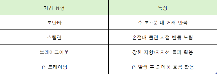 몇 초에서 몇 분 사이에 거래를 반복하면서 작은 수익을 모으는 방식이죠. 아래에서 주요 기법들을 확인해 보세요.