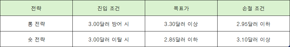 그래서 양방향 전략을 세우기에 적합하죠. 3.00달러를 중심으로 전략을 세운다고 하면 아래와 같이 정리할 수 있어요.