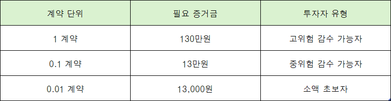 거래를 시작하려면 기본적으로 보증금 역할을 하는 증거금이 필요합니다. 그런데 이 증거금도 여러 단위로 나뉘어 있어서 본인 상황에 맞게 선택할 수 있어요.